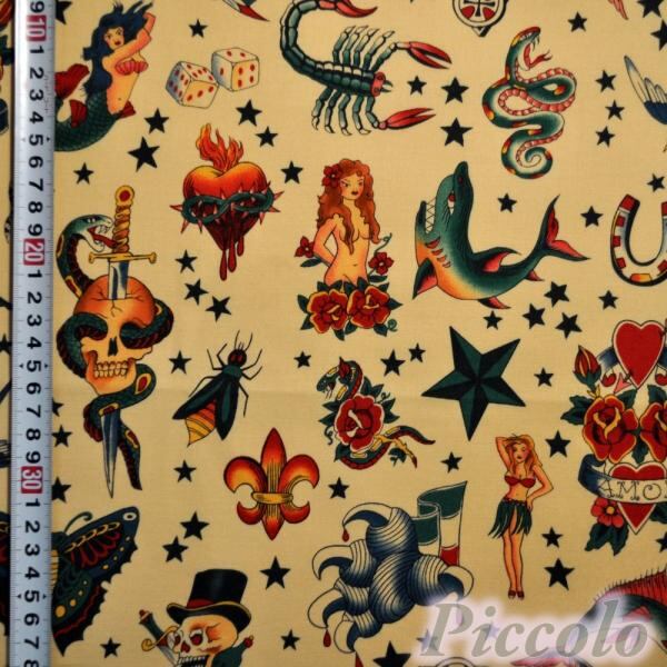 USAコットン ALEXANDER HENRY タトゥー ベージュ 約53cm×約43cm(カット済) FB-2417